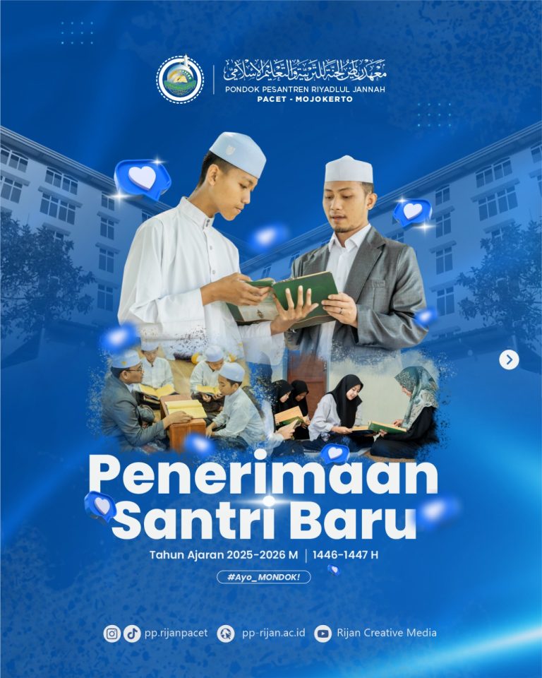 Alhamdulillah, dengan rahmat dan ridha Allah Subhanahu wa Ta’ala, Pondok Pesantren Riyadlul Jannah Pacet Mojokerto dengan ini mengumumkan bahwa pendaftaran santri baru untuk gelombang pertama tahun ajaran 2025-2026 telah resmi dibuka mulai tanggal 9 Oktober hingga 31 Desember 2024. Kami mengundang para calon santri untuk segera mendaftarkan diri dan bergabung dengan kami di Pondok Pesantren Riyadlul Jannah Pacet Mojokerto, sebuah lembaga pendidikan Islam yang berkomitmen membentuk santri menjadi pribadi yang unggul dalam ilmu agama, tangguh dalam berakhlak, serta siap bersaing secara global dengan tetap memegang teguh Al-Qur’an dan Sunnah.